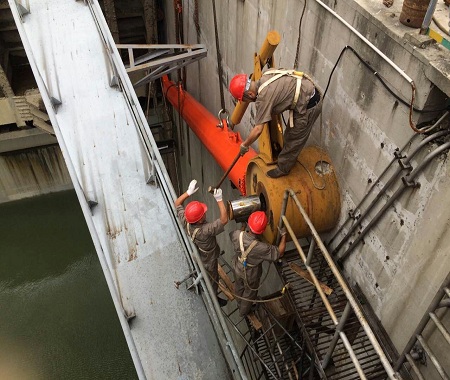 正值汛期,但是水電站的維修不能等。圖為我公司維修人員頂著酷暑,在高溫下對大型水電站表孔弧形閘門液壓啟閉機進行大修的現(xiàn)場